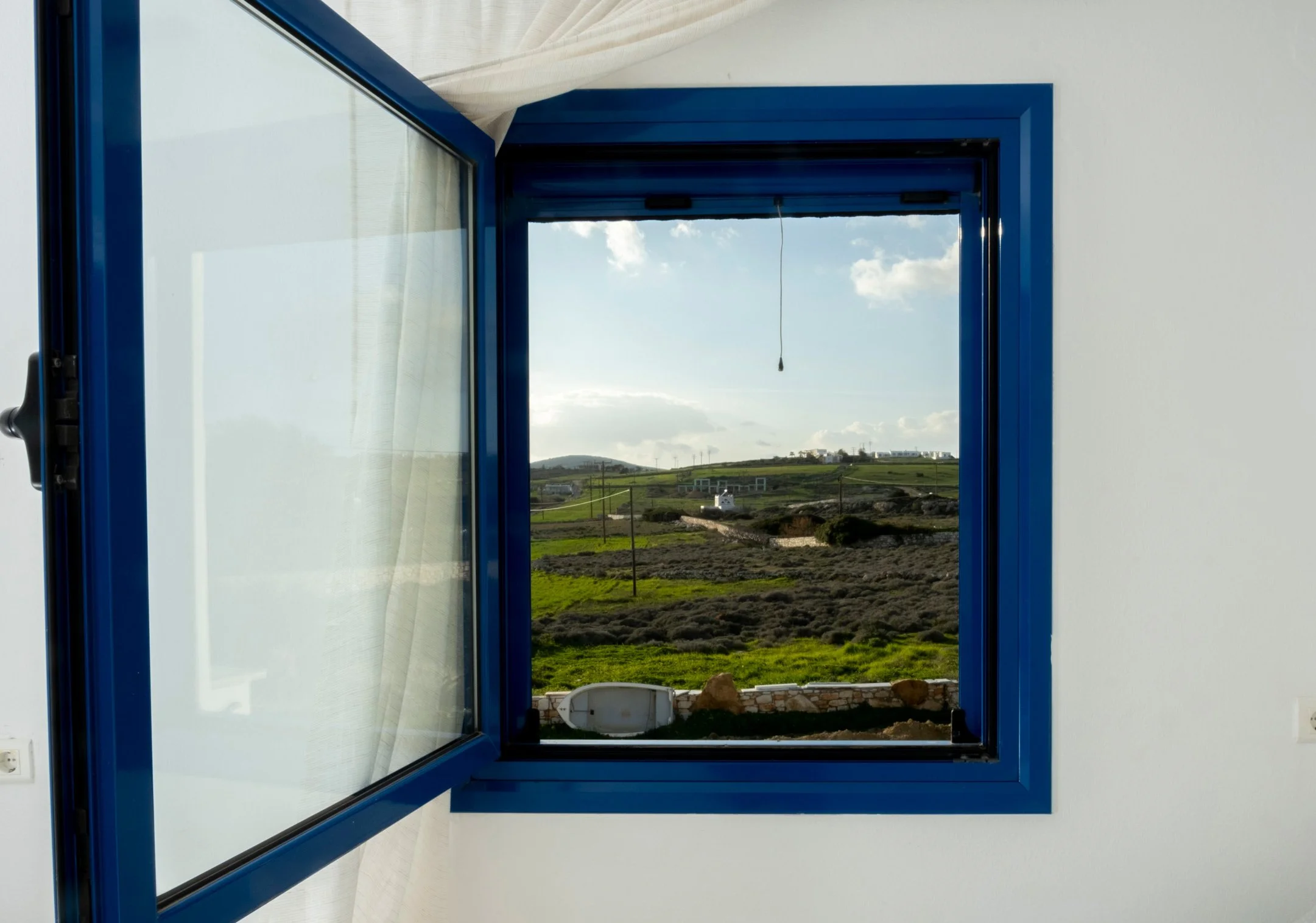 A Private studio on the second floor of the building, it has 2 Separate bedrooms each equipped with its own bathroom, sharing a common kitchen and dinning area. This studio has a generous balcony with almost 360 views of paros. Perfect fit for a family of 4-5.